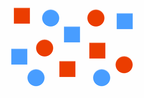 Not all signals that show similarity are equal. In the image below, would you group the objects by shape or color? Do you see a group of circles and one of squares, or do you see one red group and one blue group?