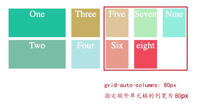 如果實際的單元格數量,超過了由 grid-template-columns 和 grid-template-rows 構成的單元格數量,那麼這些額外單元格的行高、列寬如何約定呢?
