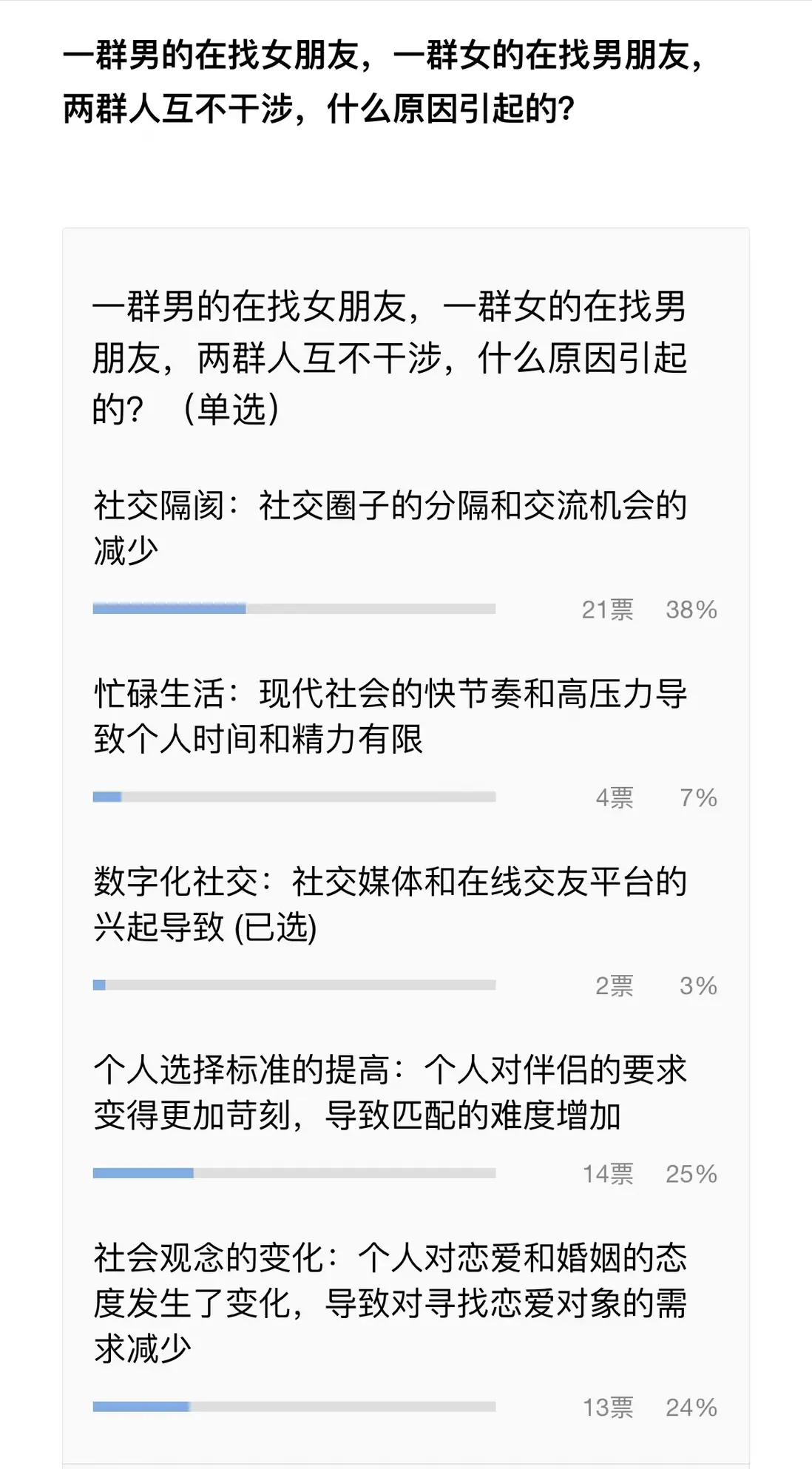 上期話題討論結果表明,社交隔閡個人選擇標準的提高是導致男女羣體互不干涉的主要原因,而社會觀念的變化也起到了一定的影響。這些因素共同作用導致了男羣體和女羣體相互獨立地尋找伴侶的現象。