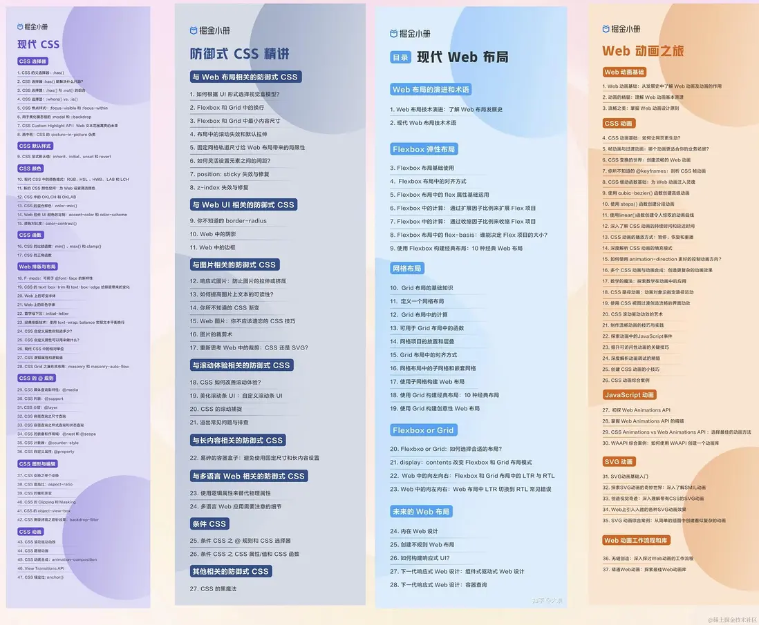 • 《防禦式 CSS 精講》:主要講述我們在編寫 CSS 的時候,應該以“萬一”的心理來編寫。該小冊也稱得上是 CSS 技巧集錦,可以實實大大的幫助你解決很多生產中碰到的 CSS 問題