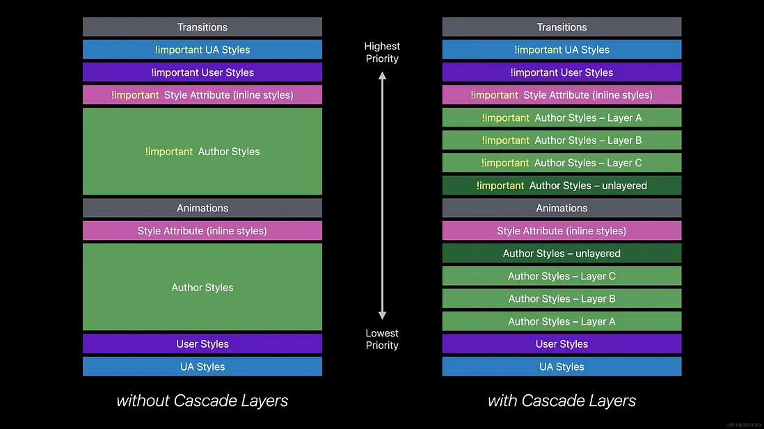 我使用下圖來闡述有級聯層 @layer 前後,CSS 級聯的差異: