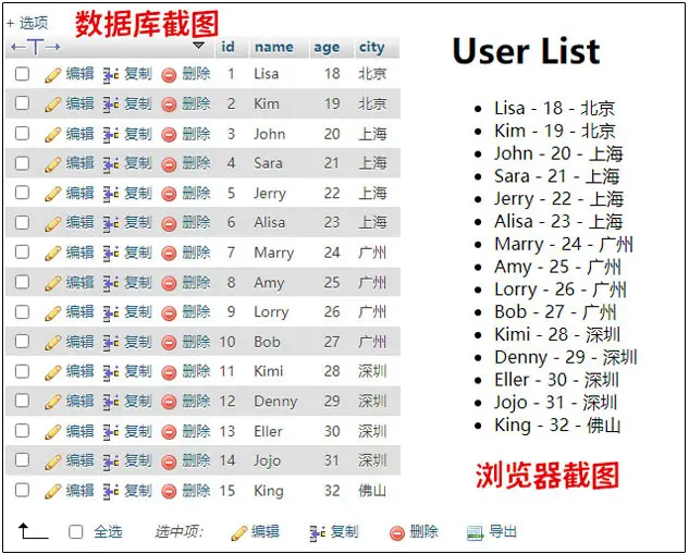 通過 User.php 控制器的 getUsers() 方法調用了 user_model 模型的 get_users() 方法獲取到用户列表,然後渲染到 user_list 視圖。