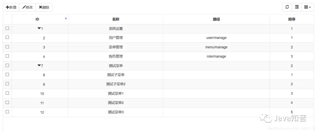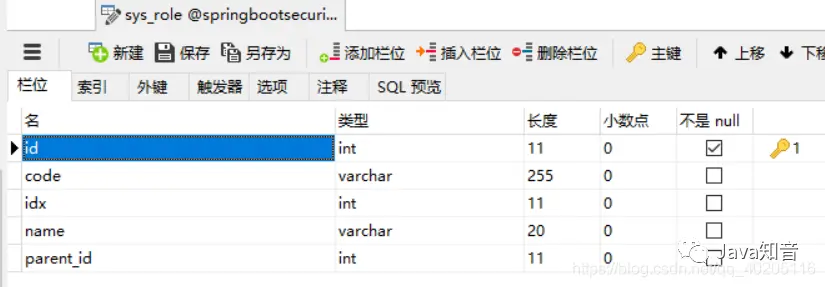 角色及菜單權限表sys_role,其中父節點parent 為null時為角色,不為null時為對應角色的菜單權限。