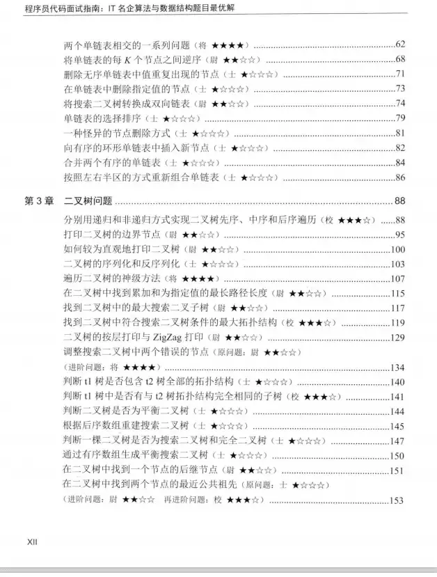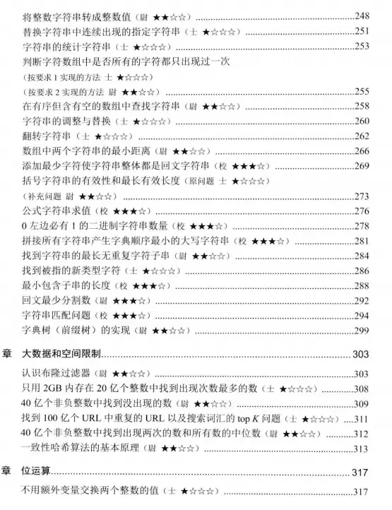 本書採用“題目+解答”的方式組織內容,並把面試題類型相近或者解法相近的題目儘量放在一起,讀者在學習本書時很容易看出面試題解法之間的聯繫,使知識的學習避免碎片化。本書將所有的面試題從難到易依次分為“將”“校”“尉”“士”四個檔次,方便讀者有針對性地選擇“刷”題。本書收錄的所有面試題都給出了最優解講解和代碼實現,並且提供了一些普通解法和最優解法的運行時間對比,讓讀者真切地感受到最優解的魅力!