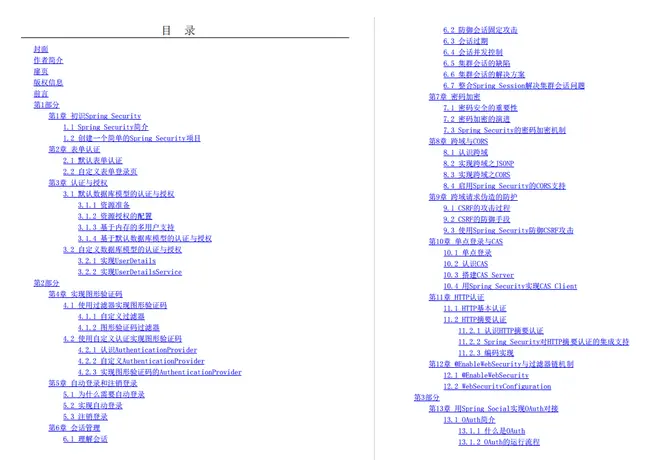 第1部分(第1章至第3章)主要介紹Spring Security的基本配置,包括默認配置、簡單表單認證,以及基於數據庫模型的認證與授權。