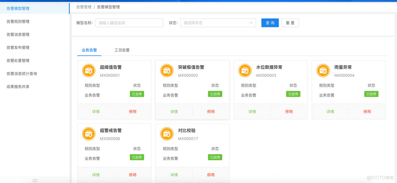 在告警模型管理模塊中,系統可靈活配置多類型業務規則,包括超閾值告警、極值突破告警、水位/雨量異常告警、超警戒告警、對比校驗告警等,並支持對模型的啓用/停用及規則詳情進行精細化管控。