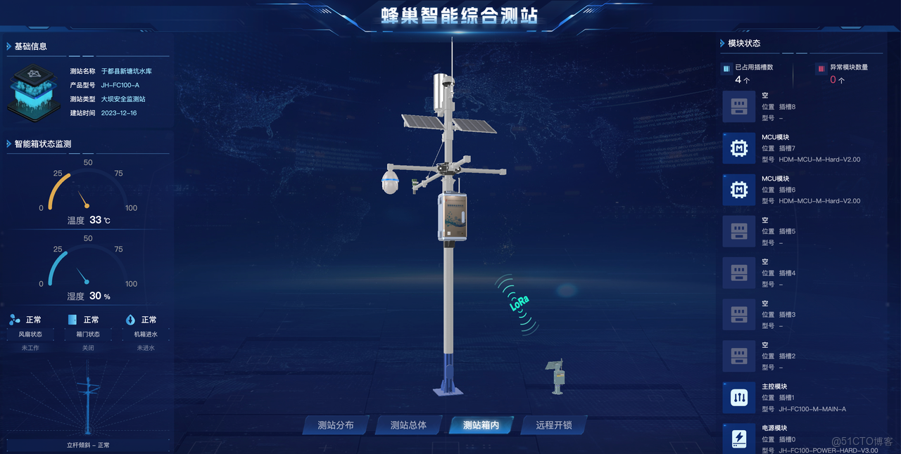 依託蜂巢式智能綜合測站,平台能夠實時採集水務現場的多維度數據,既包含環境參數(温度、濕度),也覆蓋設施運行狀態(風扇啓停、箱門開關、機箱進水、立杆傾斜度),同時還可監測 MCU 模塊、主控模塊、電源模塊等核心硬件的工況。