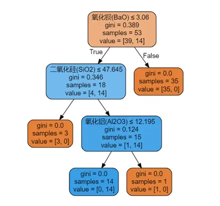 核心結論:氧化鉛(PbO)是最關鍵的分類指標——當PbO含量<5.46時,判定為高鉀玻璃;當PbO含量≥5.46時,判定為鉛鋇玻璃,模型訓練集與測試集準確率均為100%。