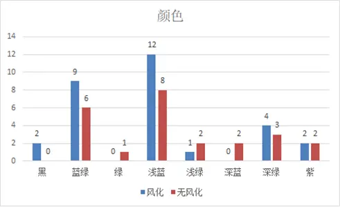 下圖為顏色與風化的關聯柱形圖,整體無明顯規律,但黑色玻璃均風化、綠色與深藍色玻璃均未風化。