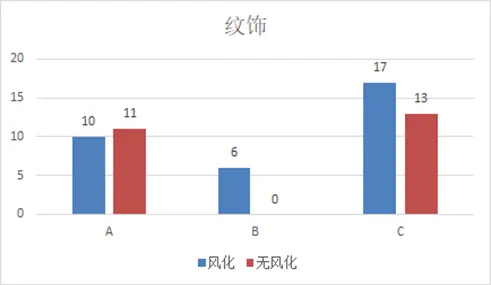 下圖為紋飾與風化的關聯柱形圖,整體無明顯規律,但可觀察到紋飾B的玻璃均風化。