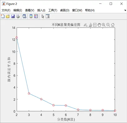 clc;clear;A = importdata('gaojia.txt');data=mapminmax(A,0,1);[n,p]=size(data);K=10;D=zeros(K,2);for k=2:K[lable,c,sumd,d]=kmeans(data,k,'dist','sqeuclidean');sse1 = sum(sumd.^2);D(k,1) = k;D(k,2) = sse1;endplot(D(2:end,1),D(2:end,2))hold on;plot(D(2:end,1),D(2:end,2),'or');title('不同K值聚類偏差圖') xlabel('分類數(K值)') ylabel('簇內誤差平方和')