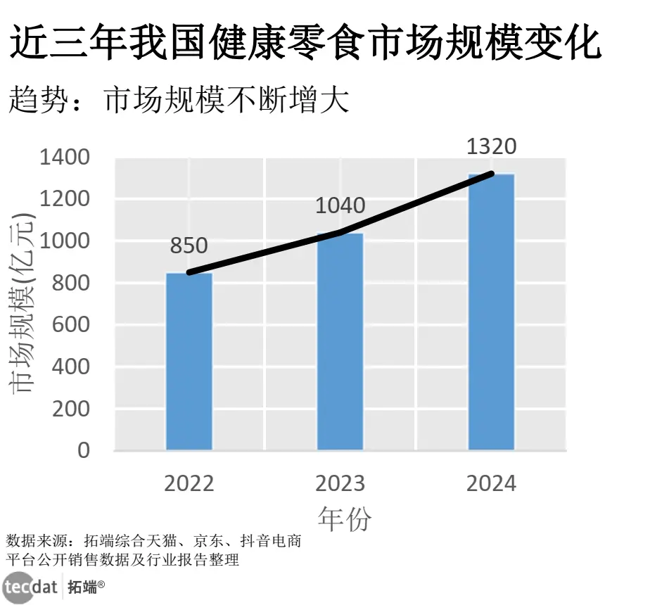 在消費認知升級與“健康化”趨勢推動下,我國健康零食市場已從“小眾需求”轉向“大眾選擇”,過去3年呈現顯著擴容態勢。