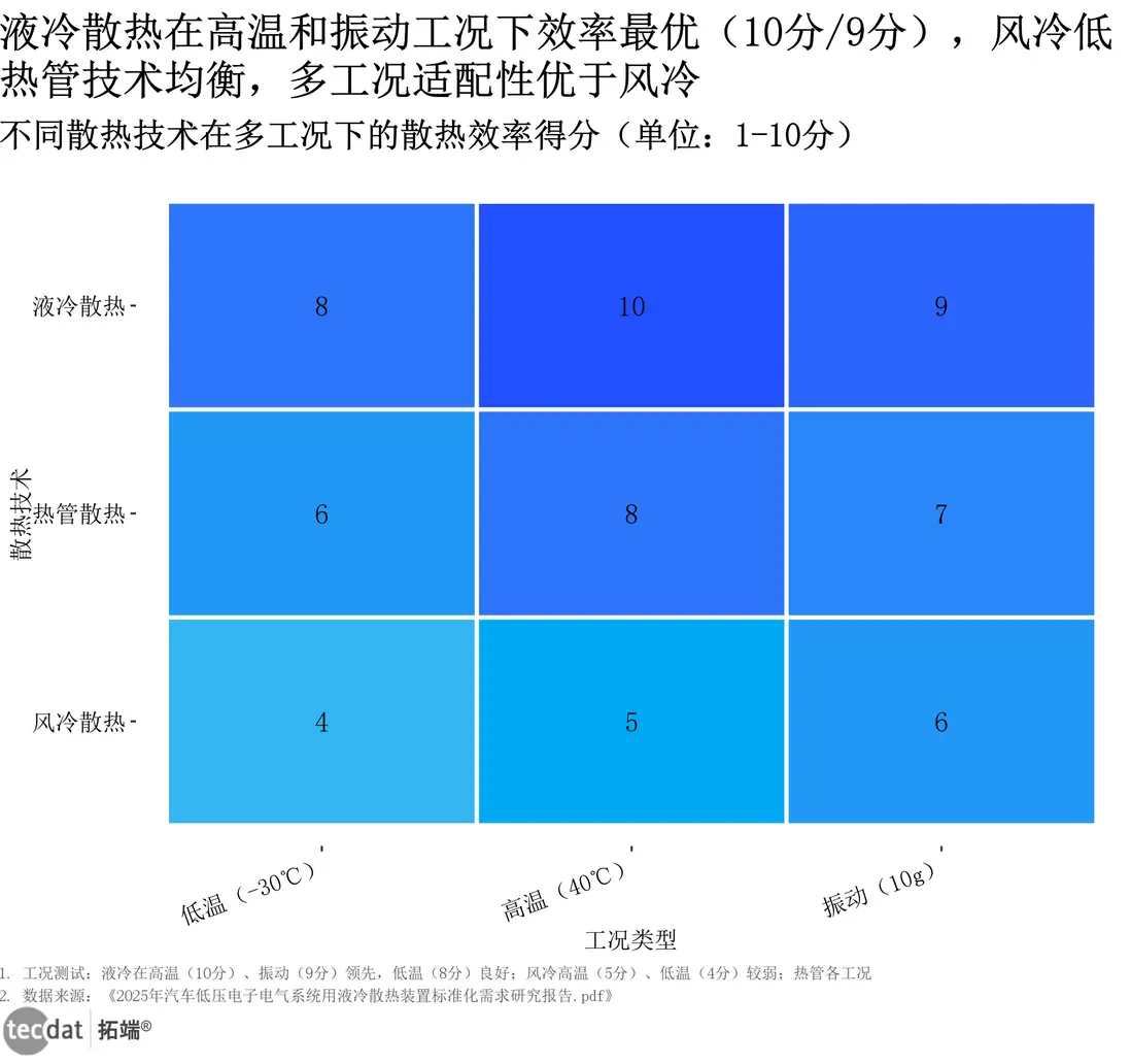 報告裏的“散熱效率得分”= 不同散熱技術在特定工況(高温、低温、振動)下的散熱效果評分(1-10分),得分越高越適合該工況。