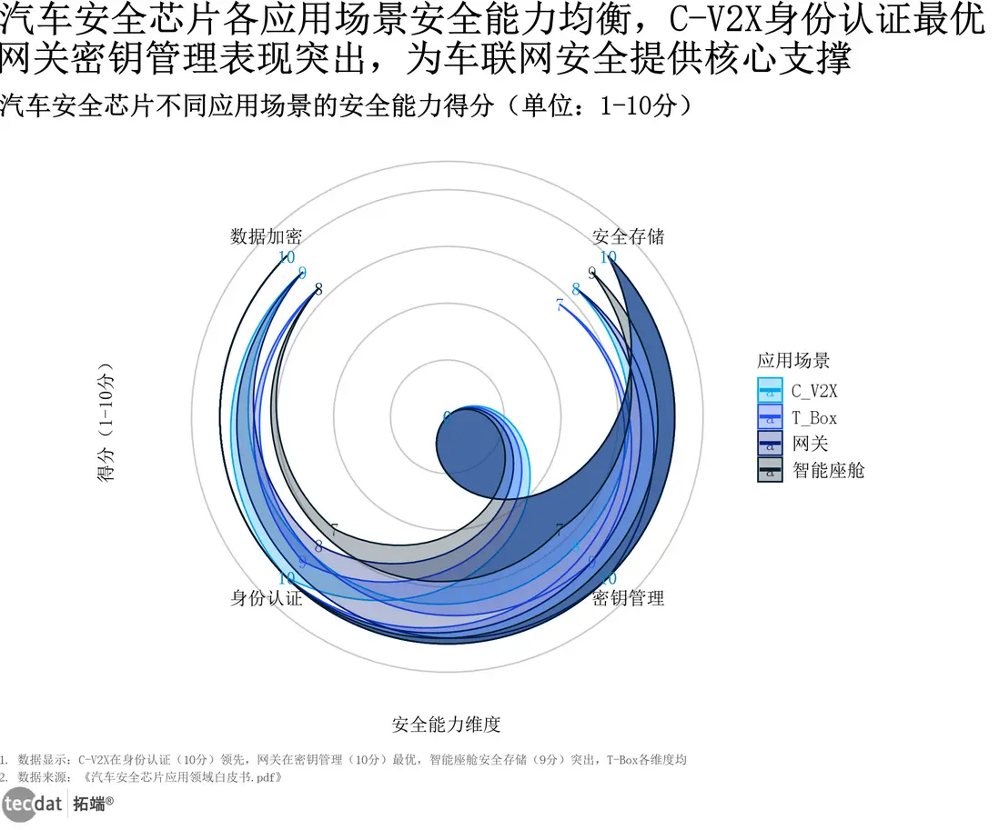 核心數據解讀:C-V2X在身份認證得10分(滿分),是車路協同場景的最優選擇;網關在密鑰管理拿10分,能高效保障整車數據傳輸安全;智能座艙安全存儲得9分,適合存儲用户交互數據;T-Box各維度得分7-9分,適配車載通信的綜合安全需求。