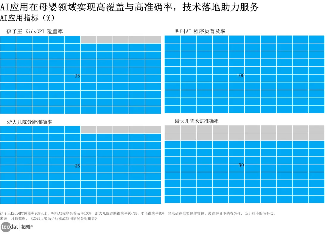 從落地效果看,母嬰AI應用呈現“高覆蓋+高準確率”特徵:孩子王KidsGPT在育兒知識問答場景覆蓋率95%+,能秒回“寶寶吐奶怎麼辦”“輔食添加順序”等高頻問題;叫叫“AI程序員”在代碼編寫、測試用例生成環節普及率100%,內容生產效率提升3倍;浙大兒院CHANGE模型對複雜先心病診斷準確率95.3%,臨牀術語提取準確率超89%——這些數據證明,AI在母嬰“服務、內容、醫療”三大場景已具備實用價值。
