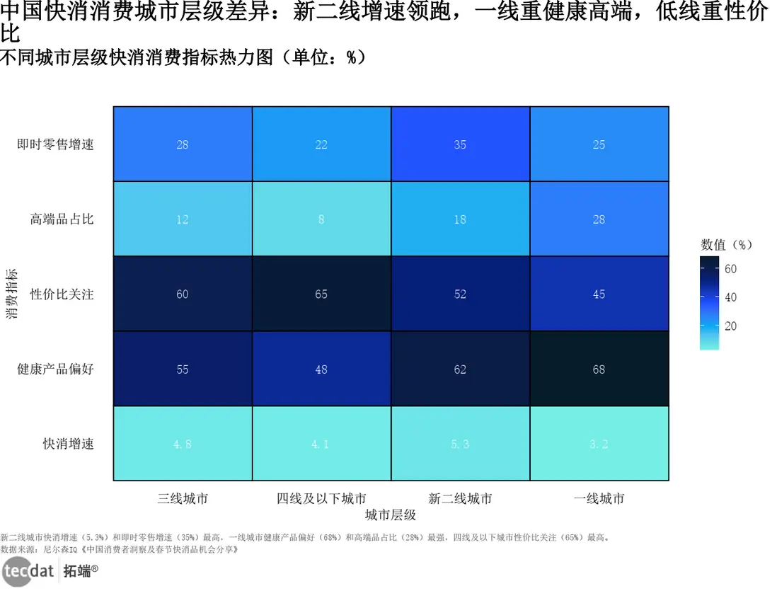 這張熱力圖用顏色深淺表示數值高低:新二線城市的“快消增速”(5.3%)和“即時零售增速”(35%)顏色最深,説明新二線是增長最快的市場,而且用户愛用美團閃購這種30分鐘達的服務;一線城市的“健康產品偏好”(68%)和“高端品佔比”(28%)顏色最深,適合推低糖、有機的健康高端產品;四線及以下城市的“性價比關注”(65%)顏色最深,要重點推高性價比的基礎款單品。