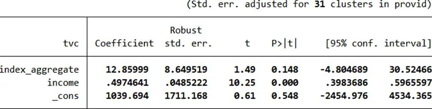 - tvc = 1039.694 + 12.85999×index_aggregate + 0.4974641×income + e3