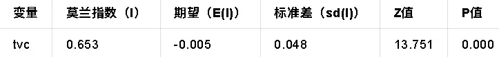 - 莫蘭指數檢驗:全局莫蘭指數為0.653,P值為0.000,表明農村人均消費支出存在顯著正向空間相關性,即高消費地區聚類、低消費地區聚類特徵明顯。