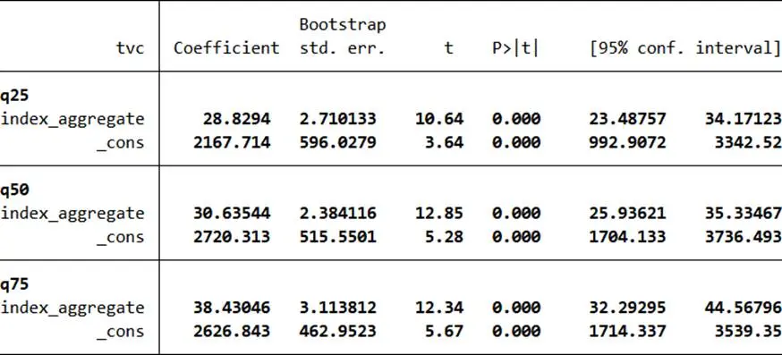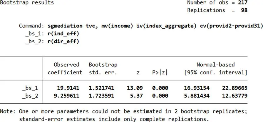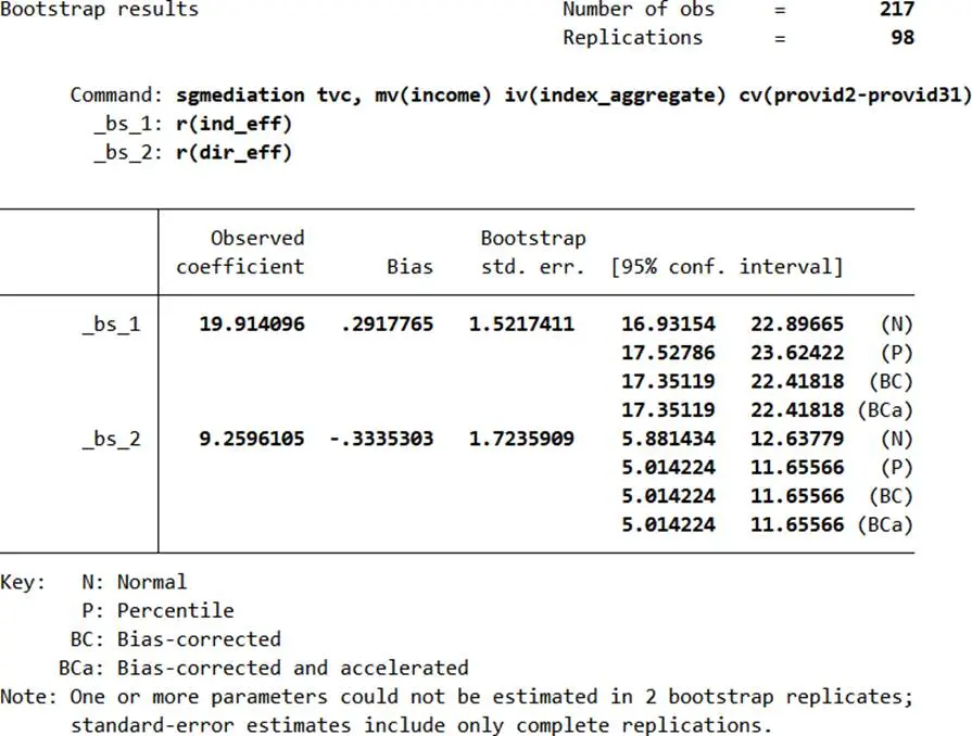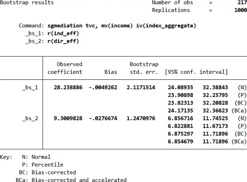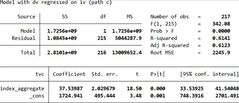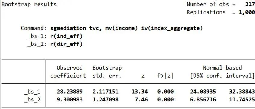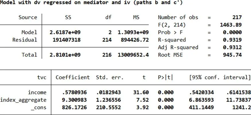 - 直接與間接效應:tvc = i3 + c’×index_aggregate + b×income + e3(b顯著説明中介效應存在,c’≠0為部分中介)
