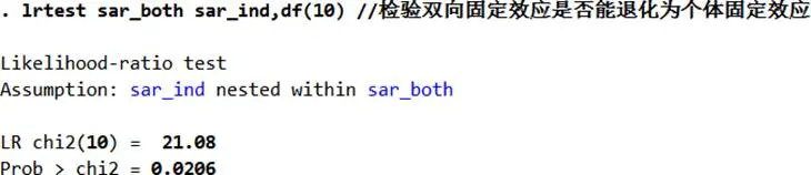 - 效應類型選擇:通過LR檢驗對比個體、時點與雙向固定效應,結果顯示雙向固定效應無法退化為個體或時點固定效應(P值分別為0.0206、0.000),最終確定構建雙向固定效應SAR模型。