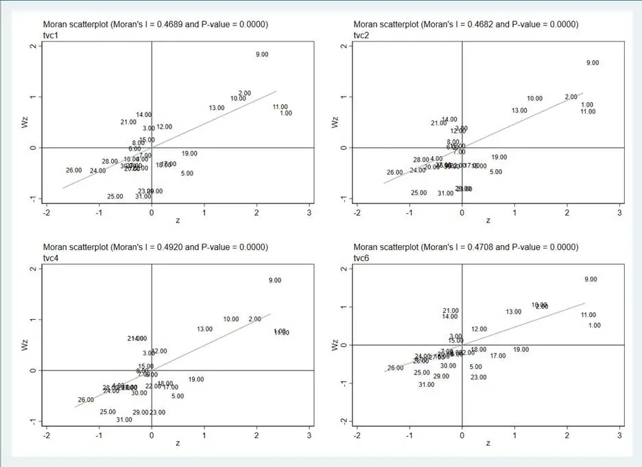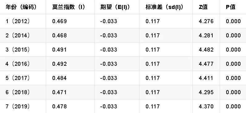 各年份全局莫蘭指數均顯著為正,進一步驗證空間正相關性的穩定性: