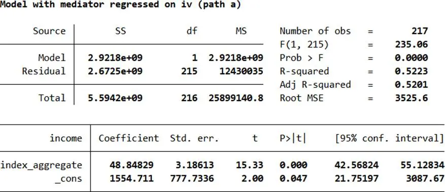 - 中介路徑:income = i2 + a×index_aggregate + e2(a顯著説明核心變量影響中介變量)