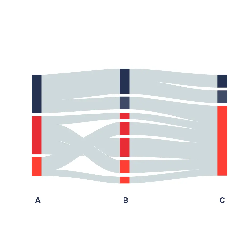 全文鏈接:http://tecdat.cn/?p=1770 沖積圖是最初開發用來表示隨時間變化的網絡結構的一種流程圖。為了兼顧它們的視覺外觀和對流動的重視,沖積圖是以流水堆積的土壤自然形成的沖積扇命名的。變量分配給平行的垂直軸。值由每個軸上的塊表示。塊的高度表示簇的大小,並且流域的高度表示由流域連接的兩個塊中包含的組件的大小。 例子