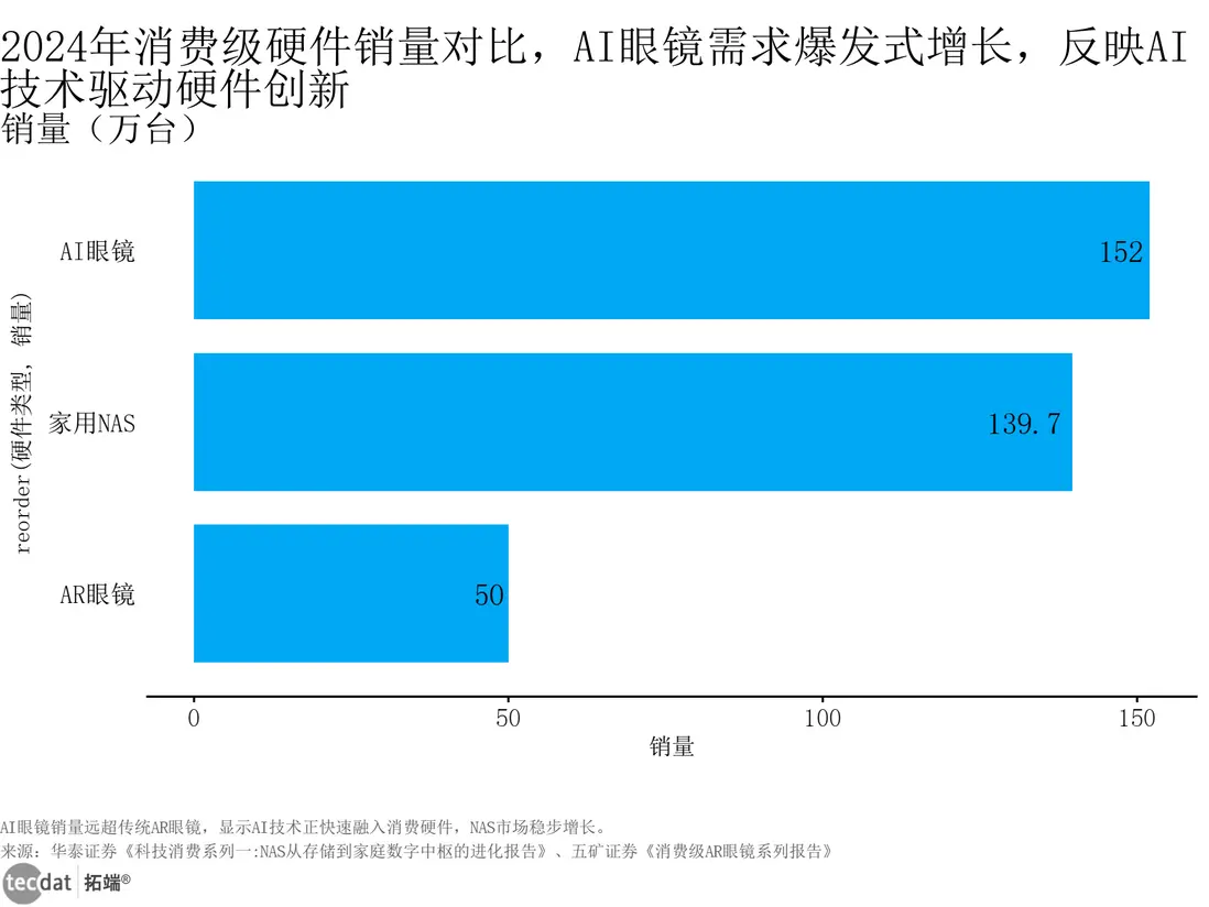 消費級硬件市場呈現“技術驅動的差異化增長”:AI眼鏡以152萬台的銷量領跑,家用NAS和AR眼鏡的銷量分別為139.7萬台和50萬台。AI眼鏡的爆發式增長,源於AI技術與穿戴設備的深度融合,為用户提供了“超越功能的體驗”(如實時翻譯、智能導航、健康監測);而NAS市場的穩步增長則反映出“家庭數字存儲需求”的崛起,成為消費升級的新方向。