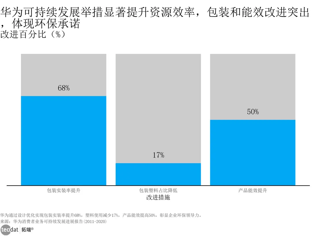 華為通過設計優化,實現包裝實裝率提升68%,包裝塑料佔比降低17%,產品能效提高50%。這不是“犧牲成本換環保”,而是通過資源效率提升實現“商業價值與社會價值的雙贏”——包裝優化降低了物流成本,能效提升減少了生產能耗,最終轉化為企業的利潤優勢。