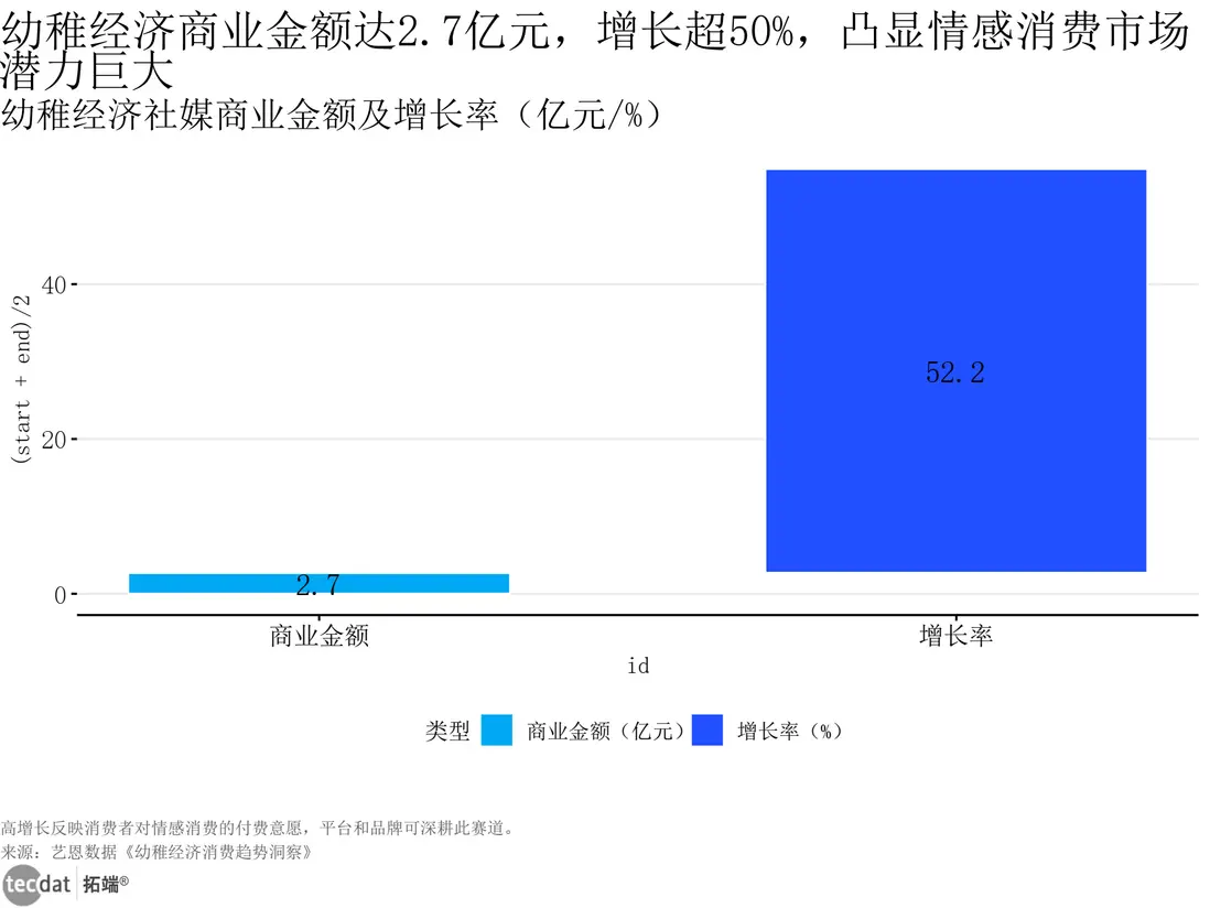 社媒營銷的投入直接帶動了“商業轉化”:2025年幼稚經濟社媒商業金額達到2.7億元,增長率高達52.2%。這一數據驗證了情感消費的商業價值,也説明消費者對幼稚經濟品類的付費意願持續提升。