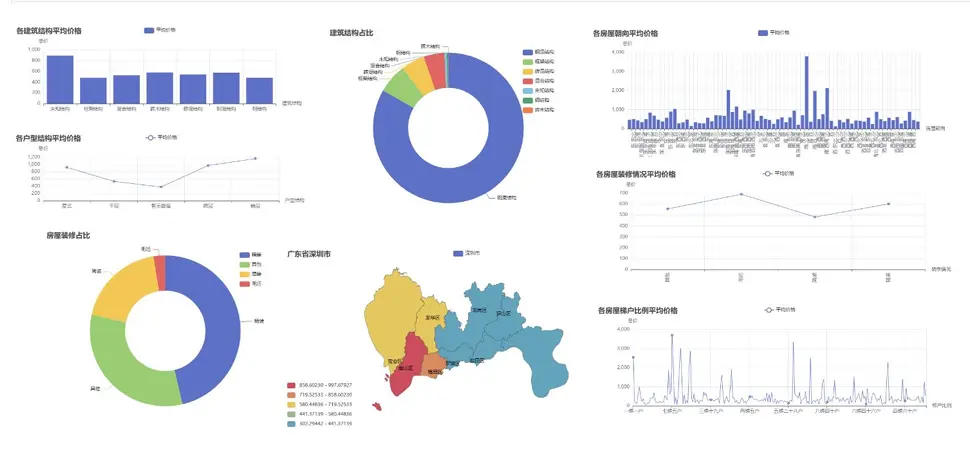 - 數據可視化大屏:整合核心指標(房源數量、均價、户型分佈等),全方位展示市場概況。