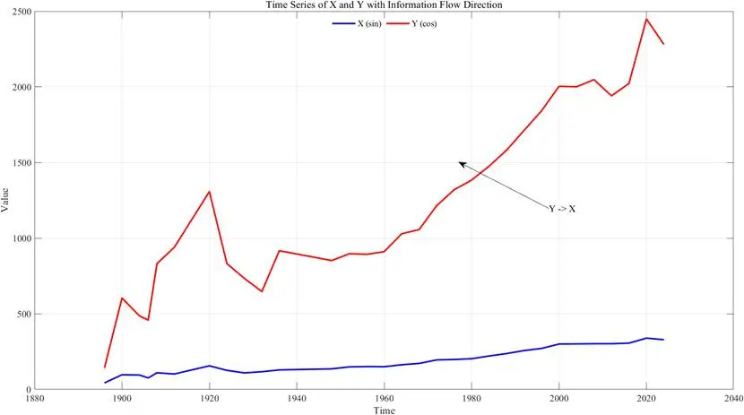 % 繪製標記因果方向的時間序列圖figure;plot(year_series, event_count, 'b', 'LineWidth', 2);hold on;plot(year_series, medal_count, 'r', 'LineWidth', 2);% 根據信息流方向添加箭頭標註if T_event_to_medal > 0 annotation('textarrow', [0.6 0.7], [0.6 0.5], 'String', '項目設置數→獎牌數');endxlabel('年份');ylabel('數量');legend('項目設置數', '獎牌總數');title('項目設置與獎牌數的因果方向標記');grid on;hold off;% 自定義信息流計算函數function T_val = calc_liang_kleeman(X_series, Y_series, t_series) if length(X_series) ~= length(Y_series) error('兩個時間序列長度必須一致'); end % 有限差分計算時間導數(省略邊界值處理代碼) dX_dt = diff(X_series) ./ diff(t_series); dY_dt = diff(Y_series) ./ diff(t_series); X_series = X_series(1:end-1); Y_series = Y_series(1:end-1); ... % 省略協方差、方差計算細節代碼 % 計算信息流值 T_val = (1 / var(Y_series)) * cov(X_series, dY_dt) - ... (cov(X_series,Y_series)/(var(X_series)*var(Y_series))) * cov(X_series, dX_dt);end