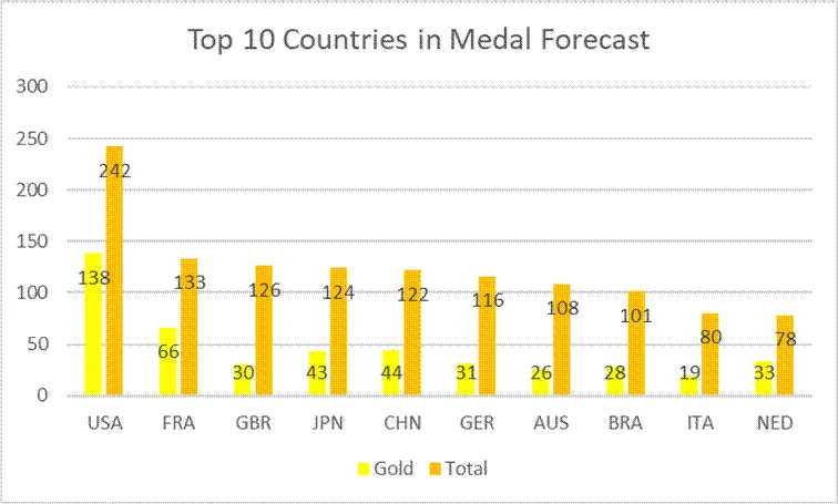 從可視化結果可見,預測值與真實值在低數值區間貼合度較高,模型能夠有效捕捉獎牌數的核心變化趨勢。2028年奧運會獎牌預測結果顯示,獎牌分佈呈現顯著的冪律特徵——體育強國與其他國家差距明顯,美國仍將保持絕對領先優勢,中日等國競爭趨於激烈。