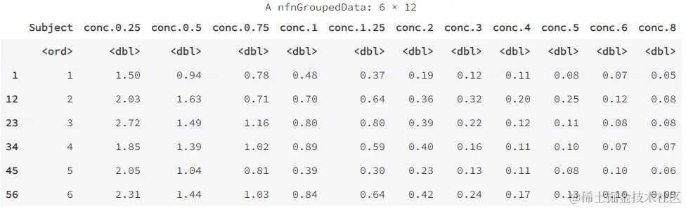 下面以 datasets 包裏的數據集 Indometh 為例進行説明。該數據集是關於藥物吲哚美辛(indometacin)的藥物代謝動力學數據,一共有 6 名試驗對象,每名試驗對象在連續的 8 小時內定時測定了血液中的藥物濃度,共有 11 次的測定值。該資料是長格式,下面將其轉換為寬格式。