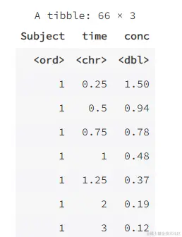 注意在上面的函數 pivot\_wider( ) 中,我們用函數 as.data.frame( ) 將數據 Indometh 轉換成了數據框,這是因為其默認類型不是數據框。數據框 wide 也能重新轉換為長格式: