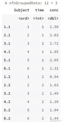 head(Indometh,12) # 這裏增加一行,預覽數據前 12 行,方便對比