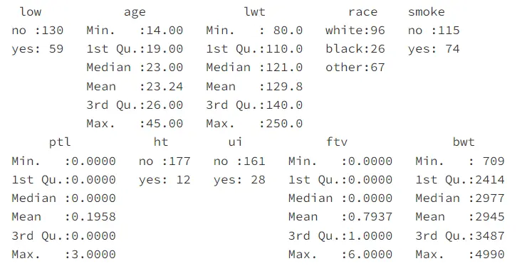 函數 summary( )可以對每個變量進行彙總統計。對於數值型變量,如 age、lwt、plt、ftv 和 bwt,函數 summary( )給出最小值、下四分位數、中位數、均值、上四分位數和最大值;對於分類變量,如 low、race、smoke、ht 和 ui,給出的則是頻數統計表。