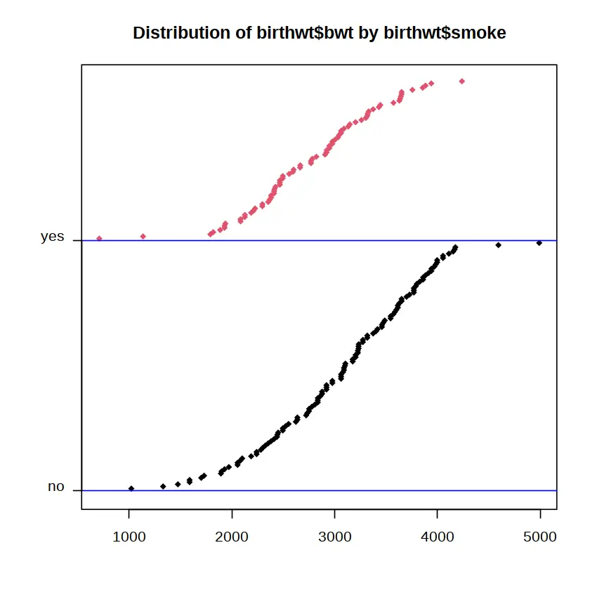 summ(birthwt$bwt, by = birthwt$smoke)