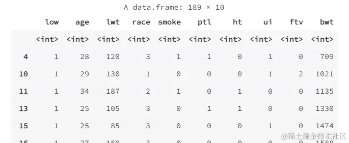 數據集 birthwt 裏一共包含 189 個研究對象、10 個變量。其中結果變量 bwt 是新生兒的體重(單位:g),變量 low 是將 bwt 的取值以 2500g 為分點轉換成的一個二分類變量。其餘 8 個變量均為預測變量,包括孕婦的年齡(age)、種族(race)、吸煙狀況(smoke)、高血壓史(ht)等。