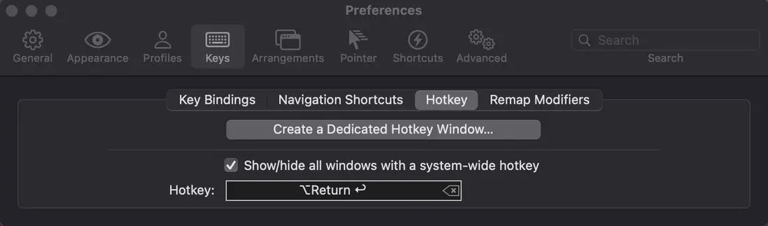 按照 iTerm2 => Preferences => Keys => HotKey 路徑找到配置項 HotKey 進行配置。