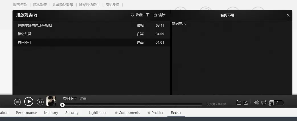 immutable和redux-persise相互不能兼容,主要原因是immutable的數據格式,redux-persist不認識,導致我們想把redux中保存的狀態不能進行本地存儲,嘗試了redux-persist-transform-immutable進行轉換還是不行,可能使用的姿勢不對,有使用過的大佬請指導一下,搞了兩三次,最後只能撤銷代碼,自己還是太菜了,哭了😥那就換一種思路,手動的只將歌曲列表進行本地存儲(只存儲歌曲id),將歌曲歌曲列表中所有歌曲