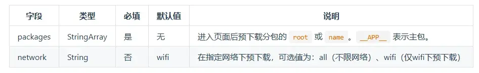 preloadRule中,key是頁面路徑,value是進入此頁面的預下載配置,每個配置有以下幾項: