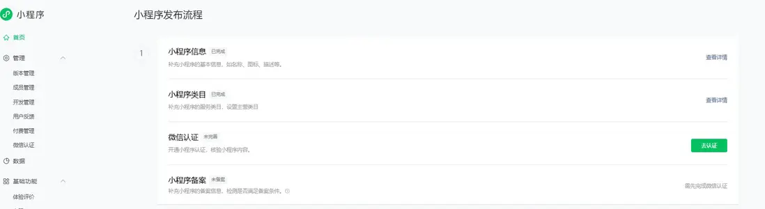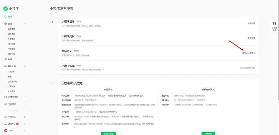 可能你在開發中還無需微信認證這一步,但上架是需要的,到這裏基本的認證就結束了,然後是開發層面的。