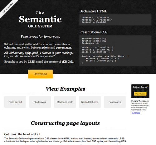 The innovations that LESS brings to CSS are the foundation for a powerful new approach to constructing page layouts. That approach is the The Semantic Grid System. This new breed of CSS grid shines where the others fall short: