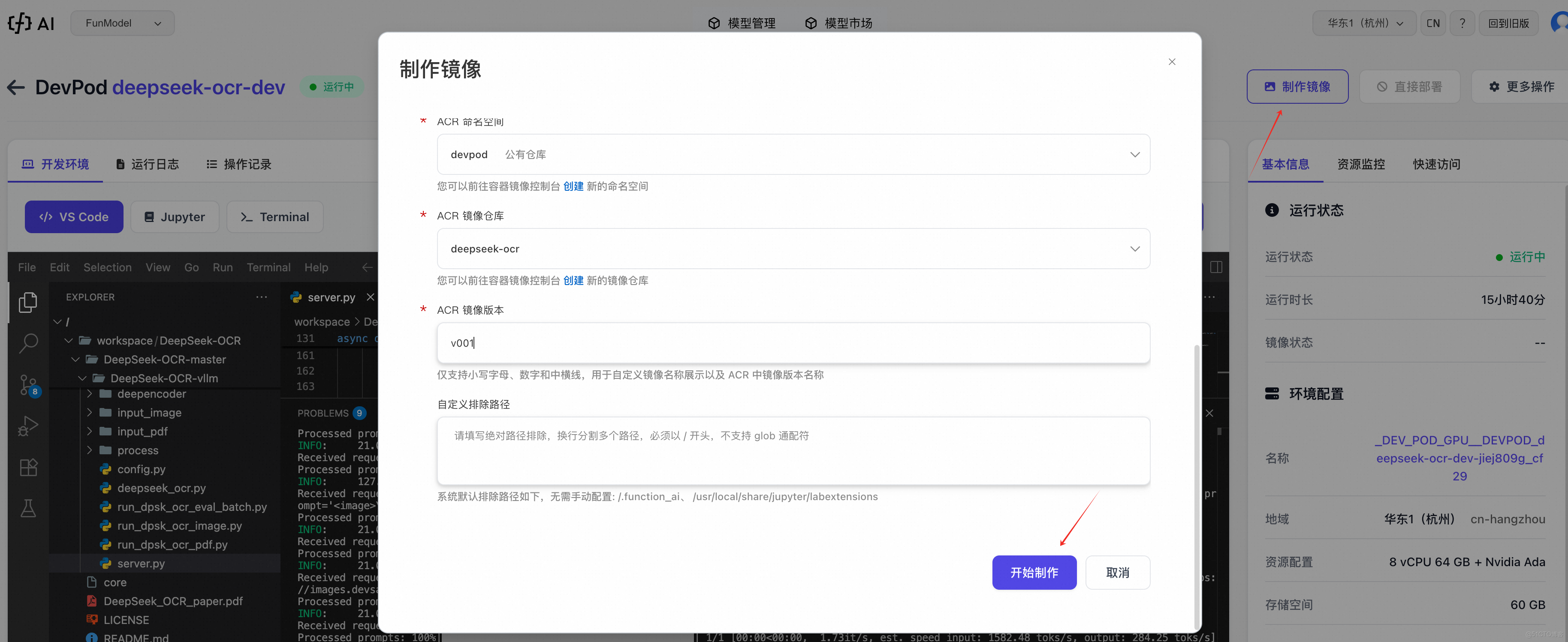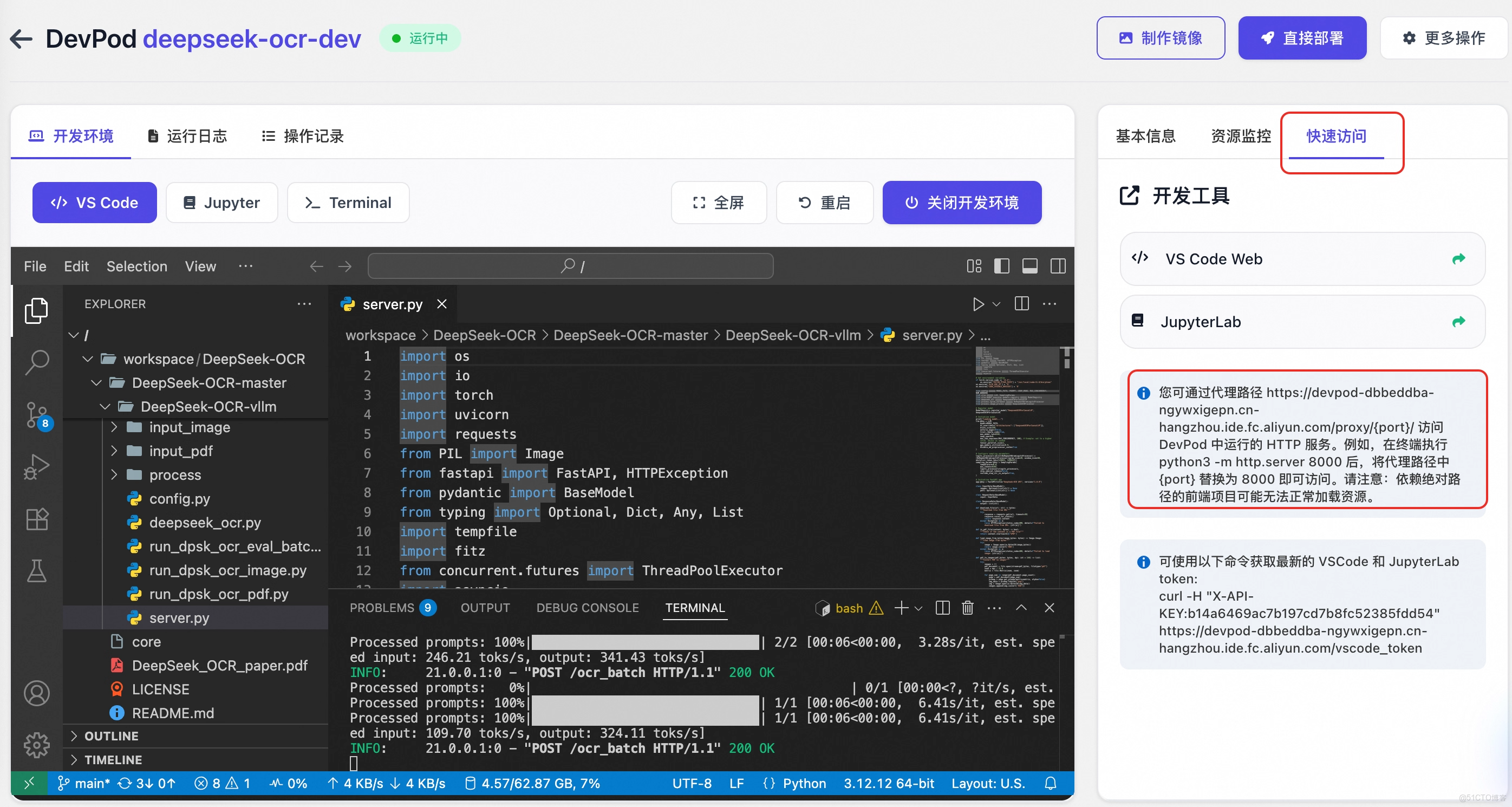 DevPod 通過統一的工作空間和無縫銜接的部署能力,打通了從代碼到服務的最後一公里。下面,我們將通過 DeepSeek-OCR 模型的實戰案例,完整演示這一工作流。