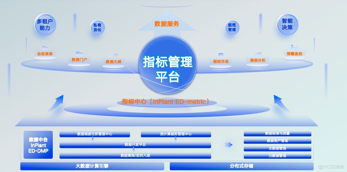 指標中心(InPlant ED-metric)為上層提供基礎支撐,指標管理平台基於此構建,具備自助報表、數據門户、數據大屏、指標市場、指標分析、預警監控等功能,最終向上輸出多租户能力、私有云化、規範管理、智能決策四類數據服務,形成從數據底層到服務應用的完整運行邏輯。