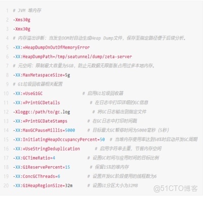 例如圍繞內存管理和 GC(垃圾回收)開展的優化。在內存管理上,限制元空間大小並配置堆內存 Dump 以分析 OOM;GC 方面,選用 G1 收集器,通過日誌、停頓時間、堆佔用率、字符串去重、線程數、分區大小等參數調優,平衡 GC 開銷與應用性能,保障內存使用效率與應用穩定性。