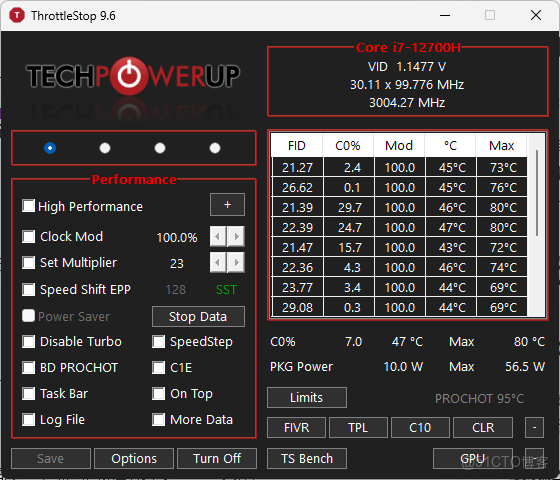 以下所有降壓offset既可以在bios裏調節,也可以在系統裏用ThrottleStop調節,二者選其一即可。對於筆者的i7-12700H和所有12代標壓處理器,即便在bios裏調節,降壓也無法生效,因此本文無法提供具體數值,建議讀者根據自己設備,自行搜索典型值。