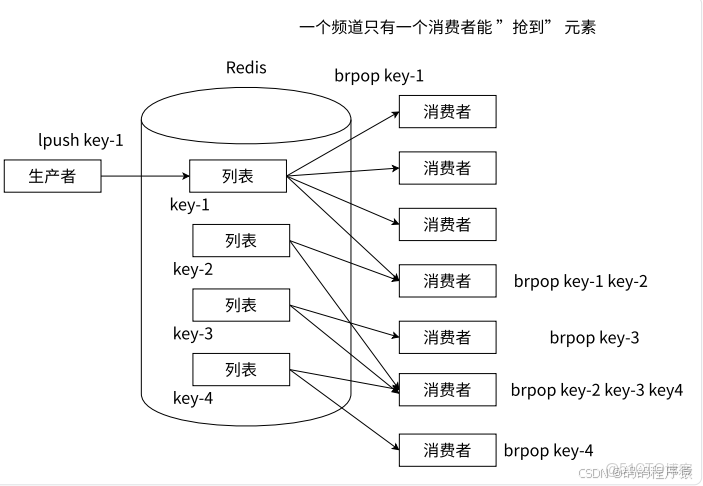 Redis 同樣使⽤ lpush + brpop 命令,但通過不同的鍵模擬頻道的概念,不同的消費者可以通過 brpop 不同的鍵值,實現訂閲不同頻道的理念。