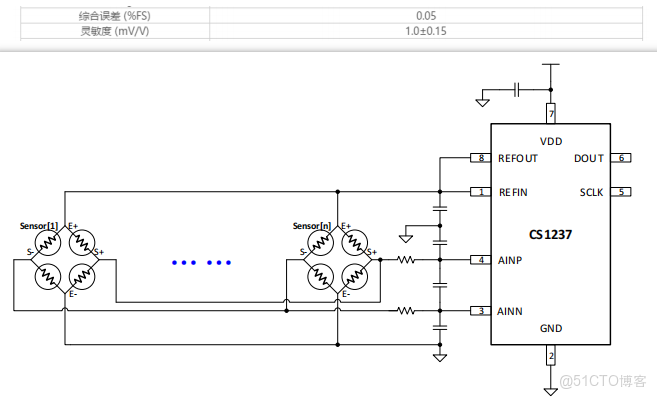 Q:CS1237/CS1238 是否內置參考電壓源? A:否。CS1237/CS1238 的 REFOUT 引腳輸出的激勵信號為 VDD,起到控制激勵源的作用。如有必要可以進入休眠模式,關閉激勵源節省橋式傳感器功耗。如下圖所示: Q:實際應用中,多個稱重傳感器應該怎麼與 ADC 連接? A:如果傳感器是測量同一物體(例如:廚房垃圾處理器),一般建議使用並聯的方式。則相同類型的信號線連接在一起。對於傳感器的要求是產品規格儘量一致,尤其是靈敏度需要一致,否則會導致偏載問題。如果使用 REFOUT 引腳輸出 VS,需要注意傳感器的激勵電流是否在合理範圍內。舉例: